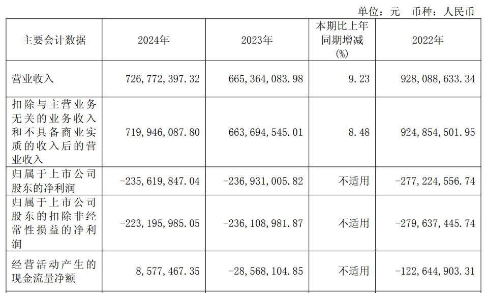 2022年至2024年, 松炀资源 的营业收入分别为9.28亿元、6.65亿元和7.27亿元;归属于上市公司股东的净利润分别为-2.77亿元、-2.37亿元和-2.36亿元;归属于上市公司股东的扣非净利润分别为-2.80亿元、-2.36亿元和-2.23亿元;经营活动产生的现金流量净额分别为-1.23亿元、-2,856.81万元和857.75万元。