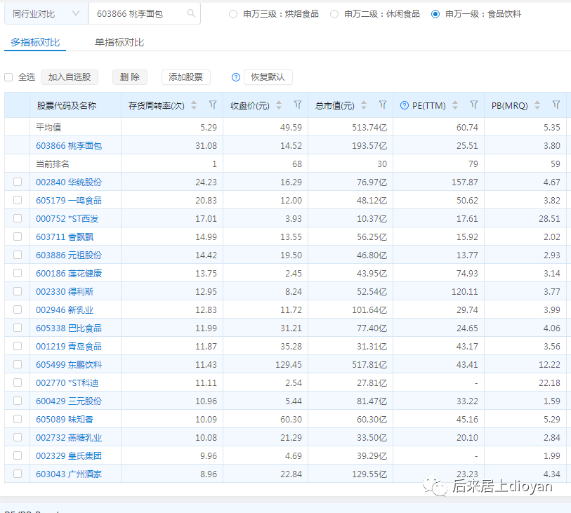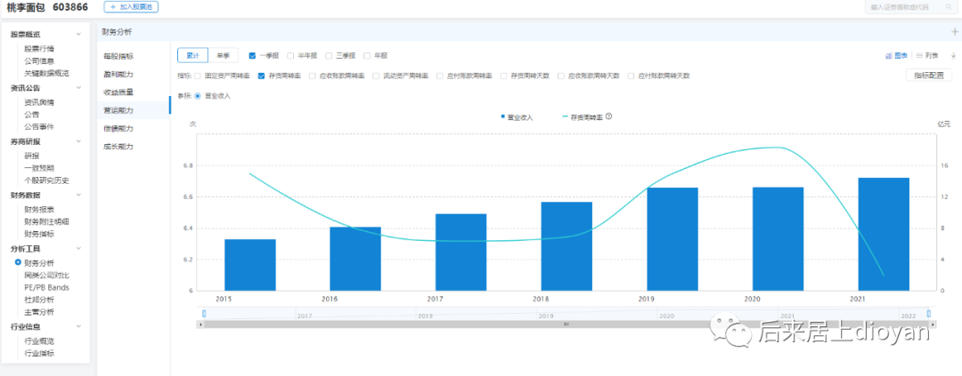 我一直认为用股价走势来应证价值逻辑是更准确更贴近真实的复盘方法。按照我的理解,桃李的看点和核心指标就是存货周转率。所以我预设了存货周转率作为观测点,认为这个很可能和股价有直接相关。