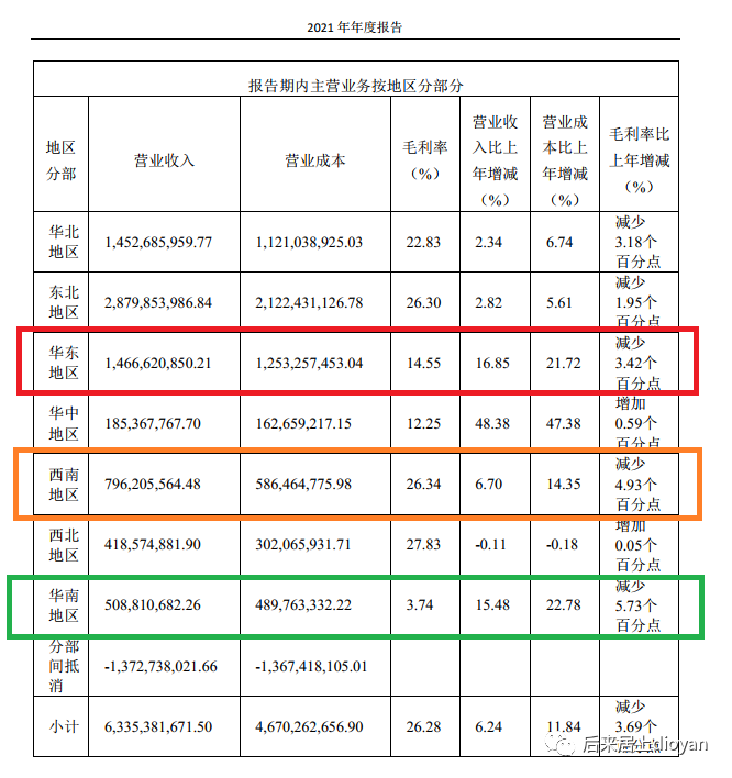 桃李的全国拼图还没有完全完成,尤其是南方几大区域。如果能再给点时间,是有机会更进一步的。但话说回来这个更进一步也不是那么容易(从60分进步到80容易,从80分进步到100分可就难得多了),从数据看,恰恰是这几个区域的业务,去年毛利率下降是最大的。主营业务按地区分见图4
