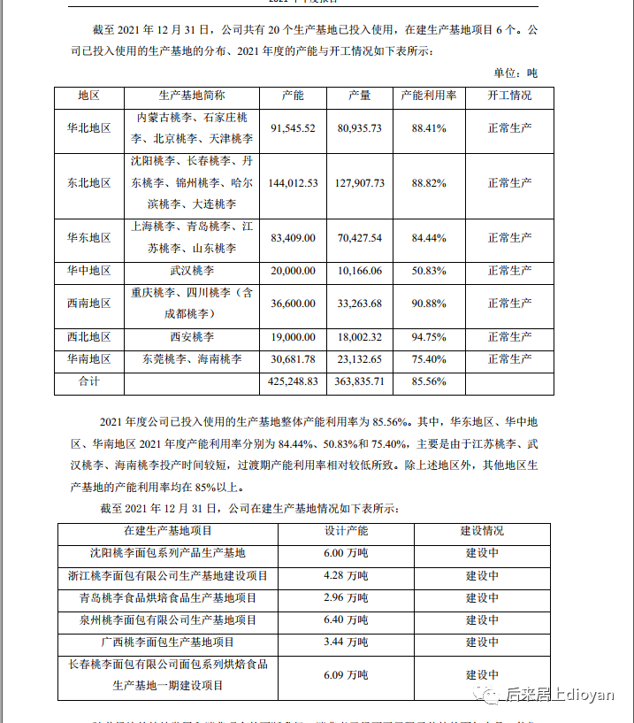 桃李39家区域子公司(包括已注销的2家),2021年报显示有14家是亏损的,主要集中在南方,比如上海,江苏,浙江,深圳,全都是亏损。这些都是巨大的消费市场,如果说大部分长江以南的中国消费者都不接受中央工厂的短保面包,那显然不是这么回事。比如江苏、武汉、海南是因为投产时间短产能还没上来。浙江、泉州、福州、厦门的亏损按常规思路应该是因为暂时没有对应的产能基地,但对应的浙江和泉州生产基地已经在建设中。这些只要多给一点都可以改善。