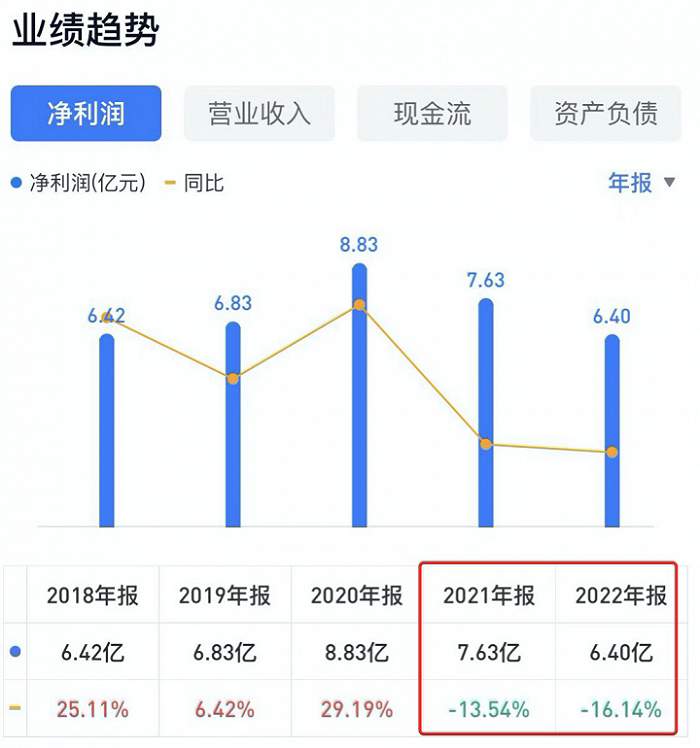 但后来的业绩情况,打消了这一说辞。再看期间对应的净利润分别是6.42亿、6.83亿、8.83亿、7.63亿、6.4亿,在2021年之前桃李面包的利润增幅还在上升,但到了2021年之后,利润增幅为负。
