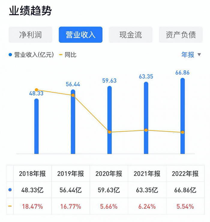 据财报显示,2022年,桃李营收66.86亿,较去年的63.35亿,同比增加了5.54%;