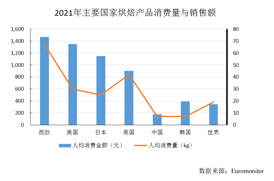 就行业整体发展状况而言,艾媒咨询的数据显示,我国烘焙食品市场规模保持稳定增长,从2018年的1956.1亿元上涨至2022年的2853亿元。但就人均消费量而言,中国仍处于较低水平。根据 Euromonitor 对2021年主要国家烘焙产品消费量与销售量的统计数据不难看出,烘焙产品仍然没能真正“走上”中国人的餐桌。