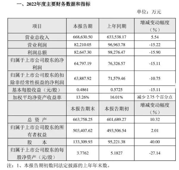 桃李面包发布的2022年度业绩快报显示,2022年实现营业总收入66.86亿元,同比增长5.54%;实现归属于上市公司股东的净利润6.48亿元,同比下滑15.11%。