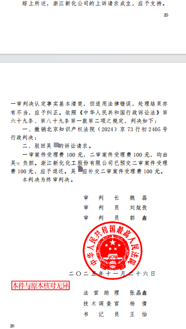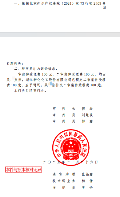 近日,最高人民法院就两起涉及浙江新化化工股份有限公司(简称“ 新化股份 ”)(2024)最高法知行终1283号、1284号作出终审判决,撤销 北京知识产权法院 (2024)京 73 行初 2403、2405 号行政判决,驳回吴某的诉讼请求,明确维持 新化股份 核心技术专利的合法有效性。这场历时两年多的确权之战,彰显了公司坚守创新成果、捍卫知识产权的坚定决心。