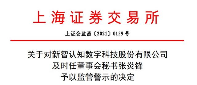上交所提出,时任董事会秘书张炎锋(任期自2018年12月6日至今)作为公司信息披露事务的具体负责人,未能勤勉尽责,对公司上述违规行为负有责任。对此,上交所作出如下监管措施决定:对新智认知数字科技股份有限公司及时任董事会秘书张炎锋予以监管警示。