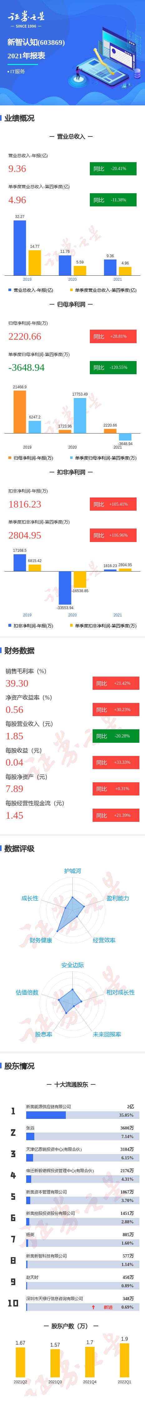 新智认知2021年报显示,公司主营收入9.37亿元,同比下降20.41%;归母净利润2220.66万元,同比上升28.81%;扣非净利润1816.24万元,同比上升105.41%;其中2021年第四季度,公司单季度主营收入4.96亿元,同比下降11.38%;单季度归母净利润-3648.94万元,同比下降120.55%;单季度扣非净利润2804.96万元,同比上升116.96%;负债率21.45%,投资收益-1479.41万元,财务费用-1848.87万元,毛利率39.3%。