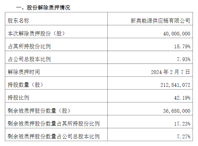 公告显示,此次新奥供应链解除质押的4000万股共占其所持股份比例18.79%,占新智认知总股本的7.93%,质押解除日期为2024年2月7日。