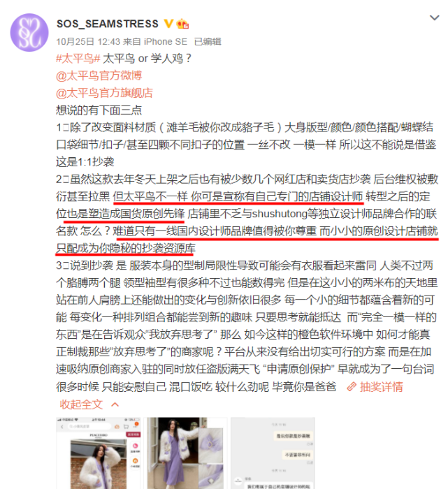 当前正值“双十一”购物狂欢之际,各大服饰品牌用尽促销手段吸引消费者,而太平鸟却因抄袭风波,陷入“多事之秋”。近日,国内一家小众原创品牌发文怒斥太平鸟抄袭,一款服饰设计完全照搬其旗下产品,甚至纽扣的位置都一样,简直是“1:1”抄袭。这还不算,对方原创品牌售价不足600元,太平鸟抄来的服饰直接敢卖3260元。此事一时闹得沸沸扬扬,在微薄上成为热门话题。
