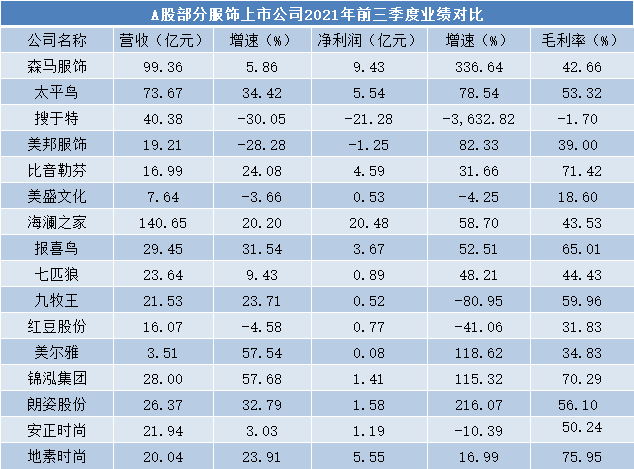 《每日财报》注意到,2021年以来国货崛起,国产服饰品牌越来越受到消费者认可,太平鸟也取得不错的成绩。A股主要服饰上市公司整体表现突出,10家企业实现营收与净利润双增。