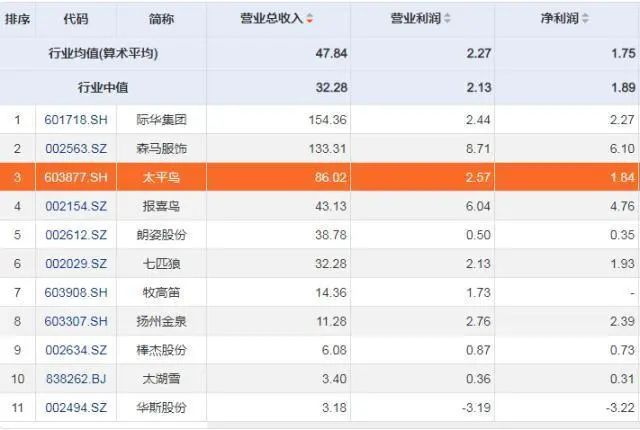 金融界上市公司研究院的数据显示,随着上市服装企业的年报陆续披露,服装行业的整体困境逐渐显出眉目。除太平鸟之外,朗姿股份、森马服饰、七匹狼等都发生业绩大幅下降,华斯股份发生亏损。相比而言,太平鸟整体处于行业前列,营业总收入、营业利润和净利润规模均高于行业均值。