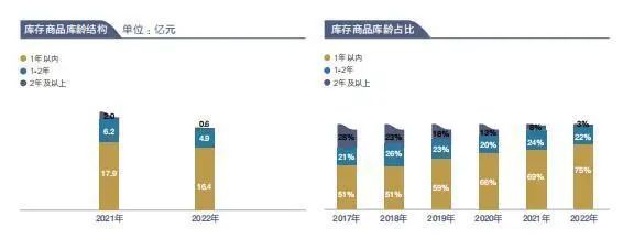 具体来看,2022年报告期末,太平鸟库存商品原值22.0亿,同比降低4.1亿,降幅15.7%,库存管理改善主要受益于强化商品产销计划性管理,当年新品库存逐渐得到优化;强化过季老品的消化处理,2年及以上货品库存明显降低,占比由最高时期的28%逐渐控制在2022年的3%左右。