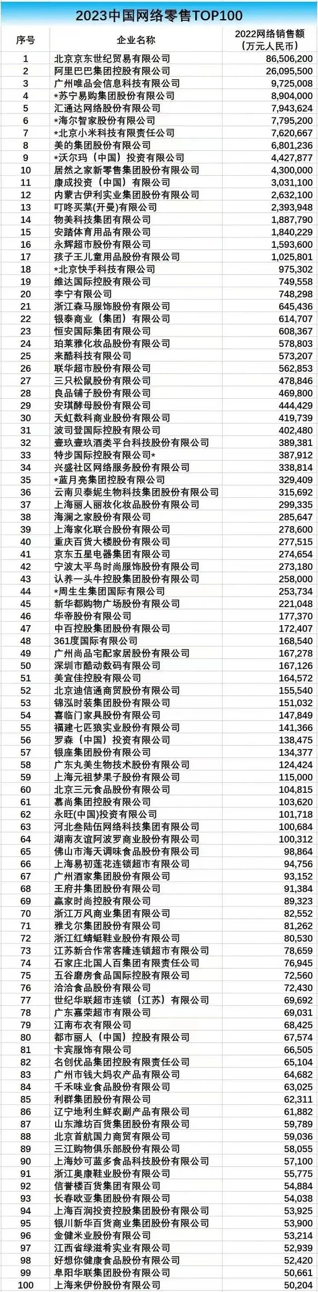 日前,中国连锁经营协会日前发布的2023中国网络零售Top 100榜单。排名前十位的企业分别为京东、阿里巴巴、唯品会、苏宁易购、汇通达、海尔、小米、美的、沃尔玛、居然之家。