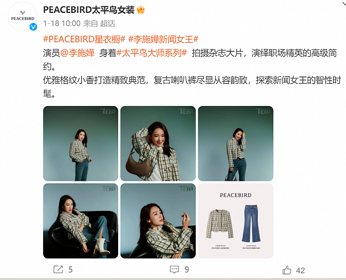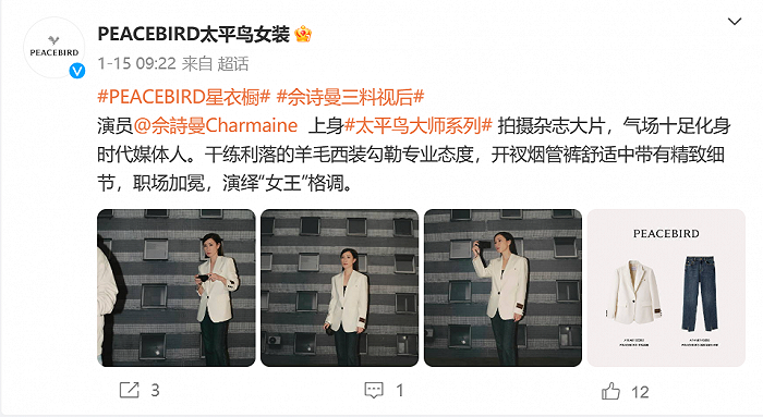 另外相较于过去品牌倾向IP等重资源投入,太平鸟开始向“轻营销”转型。比如推出PEACEBIRD星衣橱,邀请演员佘诗曼、李施嬅、毛晓彤等人拍摄杂志大片,推广太平鸟大师系列。