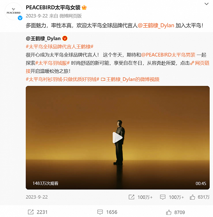 首先看太平鸟最重视的营销部分,这两年太平鸟有意在缩减这部分的费用。明星营销策略一直被太平鸟视为最关键的催化剂之一,过去品牌除了签下像王一博、欧阳娜娜这样的流量艺人外,还签约了运动员代言。近期,太平鸟在艺人使用上变得谨慎起来,整个2023年,品牌直到9月底才正式宣布明星王鹤棣为全球品牌代言人。