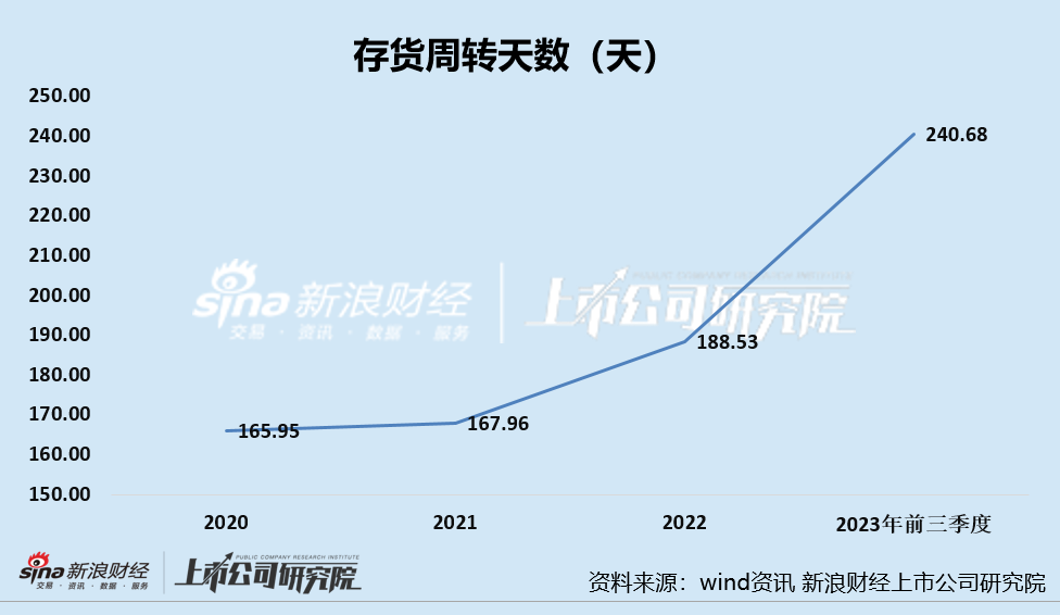 目前,公司存货金额仍然较大,占总资产比重较高。截至2023年第三季度末,公司存货规模为19.42亿元,存货占总资产的比重仍超20%为24.39%。同时,截至2023年前三季度末,公司存货周转天数高达240.68天(数据来源:wind),存货周转效率较去年同期大幅下降。也就是说,公司服装生产后平均需要8个月左右的时间才可卖出,或存在一定的库存积压状况。