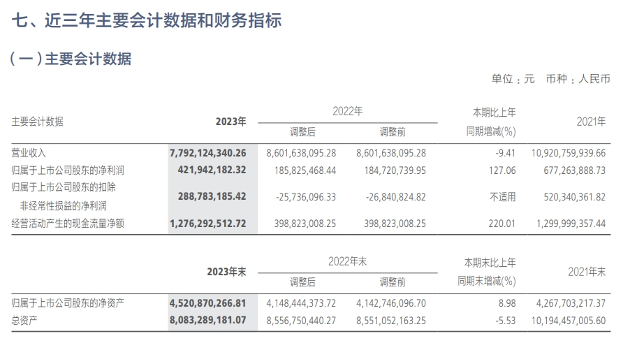 3月21日晚,太平鸟(603877.SH,股价16.65元,市值78.9亿元)发布2023年年度报告,报告期内,公司实现营业收入77.9亿元,同比下降9.4%;实现归母净利润4.2亿元,同比增长127.1%;实现扣非净利润2.9亿元,恢复增长。