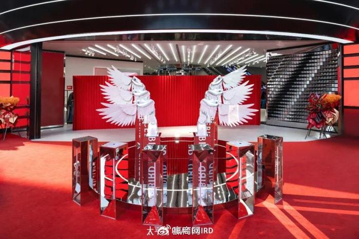 视觉上,太平鸟全球首家超级壹号店不仅在外墙的显示大屏中用强视觉冲击力的红色,吸引路人的注意力,增加门店的可见度和曝光率,更是在店内陈设了代言人同款翅膀装置的打卡点位,展现门店的科技、时尚、潮流,吸引更多的年轻、追求前卫的消费者。