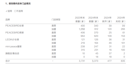 记者注意到,自2022年业绩出现大幅亏损后,太平鸟便主动优化调整低效门店。2023年一年,太平鸟的净闭店数量就达到940家,2024年,太平鸟的门店规模进一步收缩规模,其门店总数从3731家减少至3373家,净减少358家(新开477家,关闭835家)。其中,直营店总量相对稳定,加盟店大幅净减少约20%。