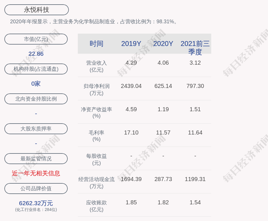 2020年年报显示,永悦科技的主营业务为化学制品制造业,占营收比例为:98.31%。