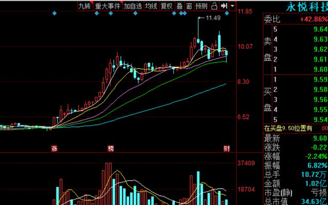 近期股价表现来看,永悦科技从6月19日的不到6元涨至8月18日的最高11.49元,近日股价回调,最新价9.6元,处在阶段高位。