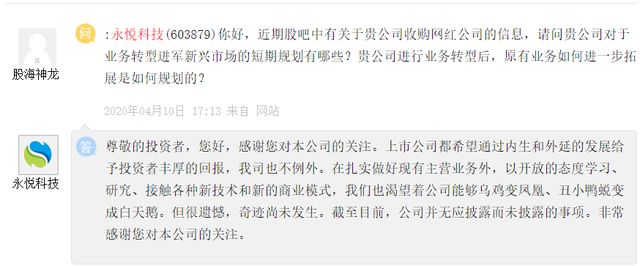 2020年4月,有股民还到互动社区核实收购事项的真实性,永悦科技方面否认,“我们也渴望着公司能够乌鸡变凤凰、丑小鸭蜕变成白天鹅。但很遗憾,奇迹尚未发生。截至目前,公司并无应披露而未披露的事项。”