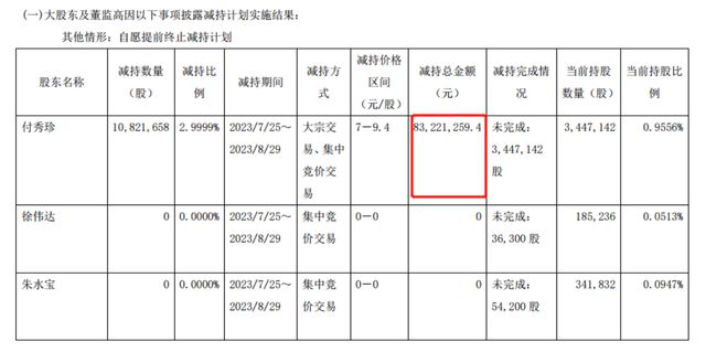 其中,付秀珍是持股5%以上非第一大股东傅文昌的一致行动人,截至公告日,付秀珍合计减持公司股份1082万股,占公司当前总股本的2.99%,套现8322万。