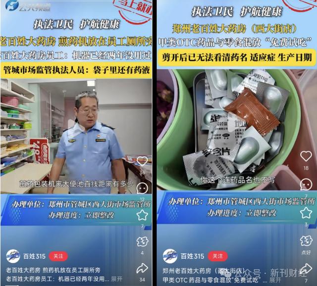 此外,连锁药店的扩张还带来合规性考验。据"百姓315"平台披露的现场执法记录显示,郑州老百姓大药房(西大街店)存在多项违规操作:其煎药设备被放置于员工卫生间毗邻区域,且储药容器内残留药液未及时清理,面对执法人员质询时,员工竟以"设备闲置两年未用"进行辩解。此外,该门店甲类非处方药(OTC)与休闲食品混放“免费试吃”,且部分药品已经无法看清药名、适应症以及生产日期,违反《药品经营质量管理规范》中关于药品存储与陈列的强制性要求。