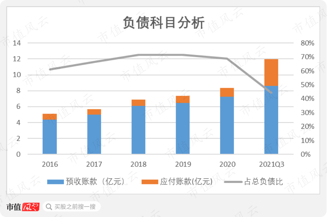 然而真实的一面是,公司的有息负债自上市以来一直为零。负债科目中占比较大的科目主要是预收账款(新准则之后是“合同负债”)、应付账款。