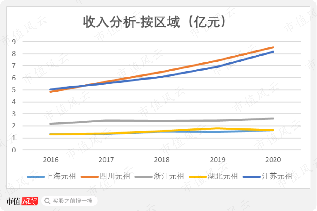 如果将公司收入按区域划分,可见各区域发展不平衡。先刨除占总收入比20%左右的线上销售不谈。公司线下门店主要收入贡献区域为四川、江苏、浙江、湖北、上海,合计占总收入比超过70%。