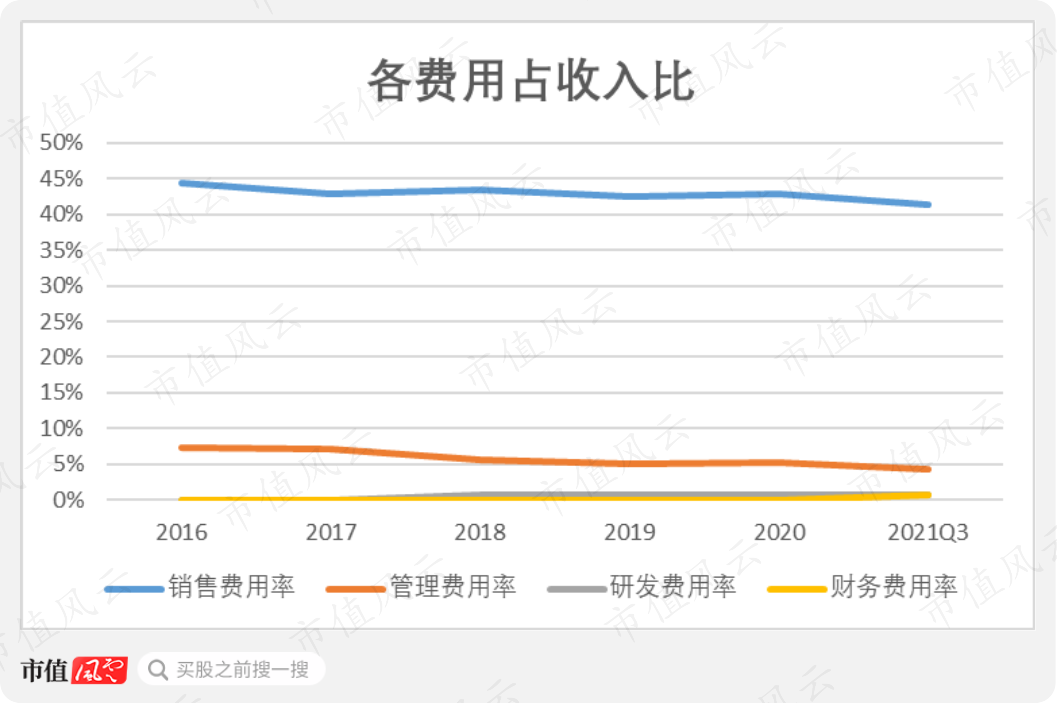 究其原因,通过分析各费用占收入比可知是公司销售费用占比常年高于40%。