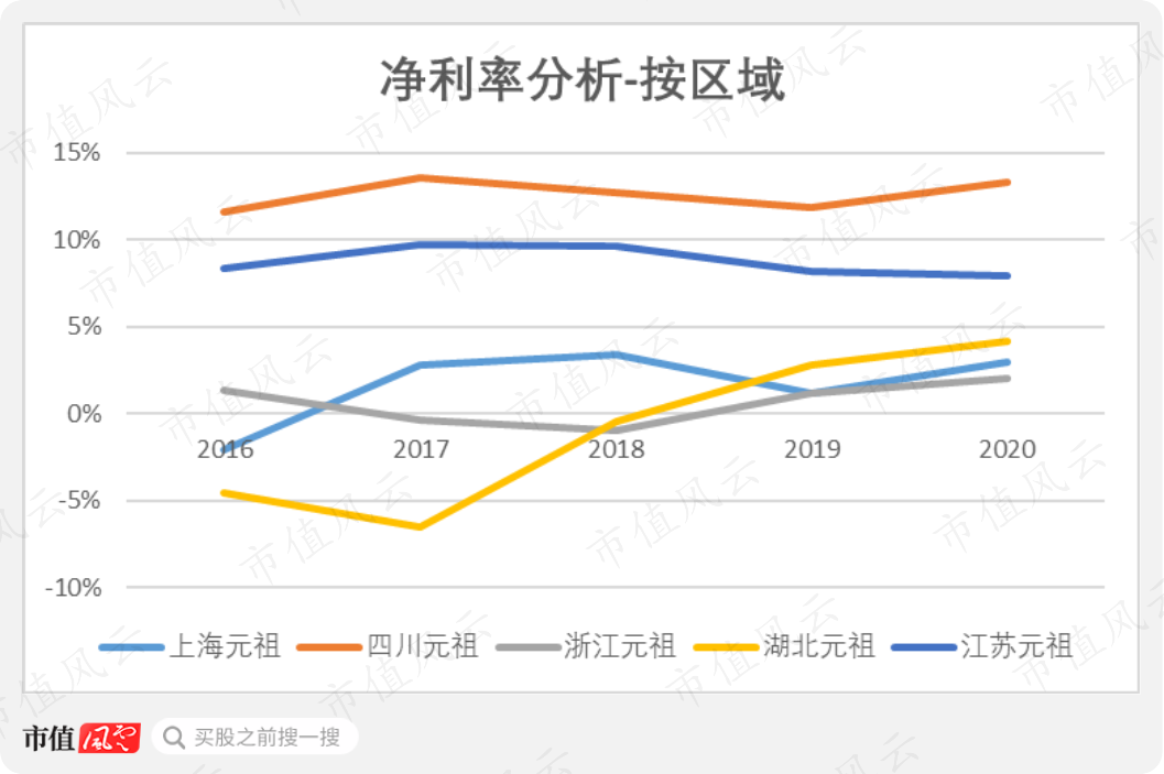 盈利能力上看,各区域差别就更大了。仅四川净利率超过10%,江苏盈利能力次之但呈下降趋势。湖北、浙江、上海甚至都出现过亏损,三地虽在近两年净利率保持正增长,但目前均低于5%。