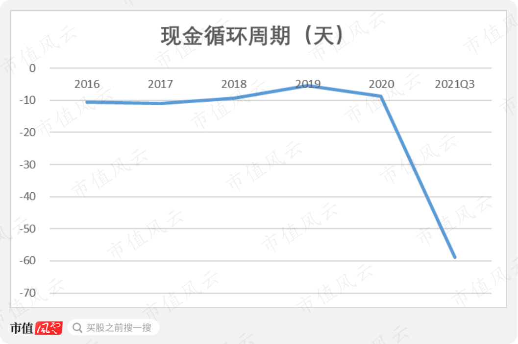通过计算现金回款周期,也可以得看出公司现金回款周期常年为负数,公司不但没有动用自己的营运资金,反而可以靠占用上游供应商资金做生意。