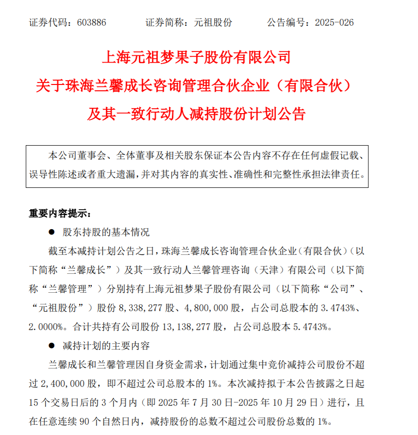 在发布2025年半年报业绩预告之前,元祖股份就发布了股东减持公告,持股5.47%的股东珠海兰馨成长及其一致行动人计划减持不超过1%股份。去年3月其曾减持3%股份套现1.2亿元。连续减持动作背后,折射出资本市场对这家老牌烘焙企业愈发强烈的看空情绪。