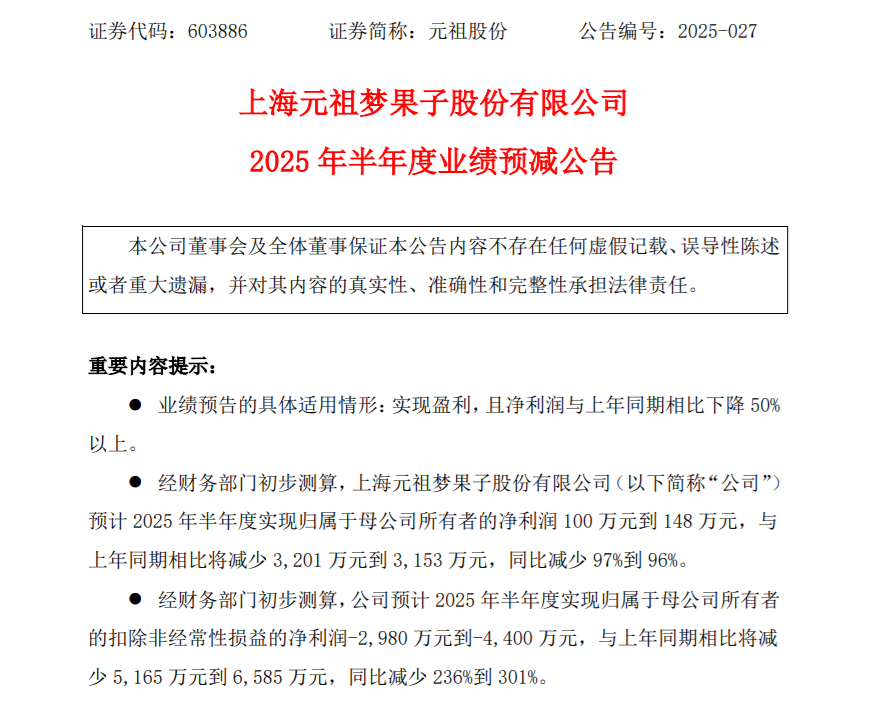 门店冷清的柜台与精致的礼盒在元祖门店内形成了鲜明的对比,这家曾以高端烘焙礼盒闻名的企业,正面临前所未有的经营压力。近日,元祖股份公布了2025年半年报业绩预告,报告期内元祖净利润下降96%-97%;扣非净利润-2980万元到-4400万元,与上年同期相比减少236%到301%。
