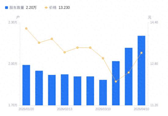 4月13日消息,数据显示,截至2026年4月10日,元祖股份A股股东总户数为2.2万户,较上期(2026年3月31日)增加875户,增幅4.13%。公司最新A股总股本为2.4亿股,其中流通A股2.4亿股,户均持有流通A股数量为1.09万股,较上期减少450.1股,降幅3.97%;户均持流通A股市值14.41万元,较上期增加2662.36元,增幅1.88%。
