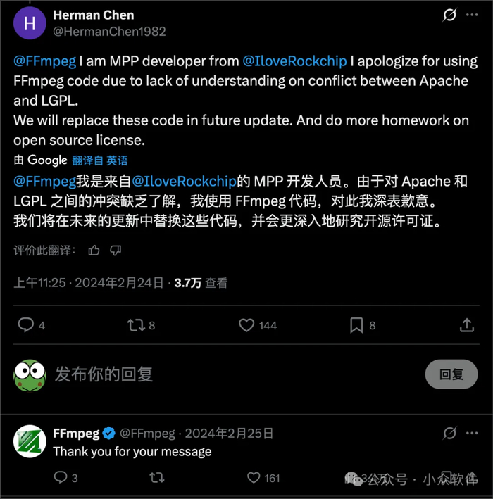 早在2024年2月份,著名的开源项目 FFmpeg 公开喊话 Rockchip 在 X 上的账号: