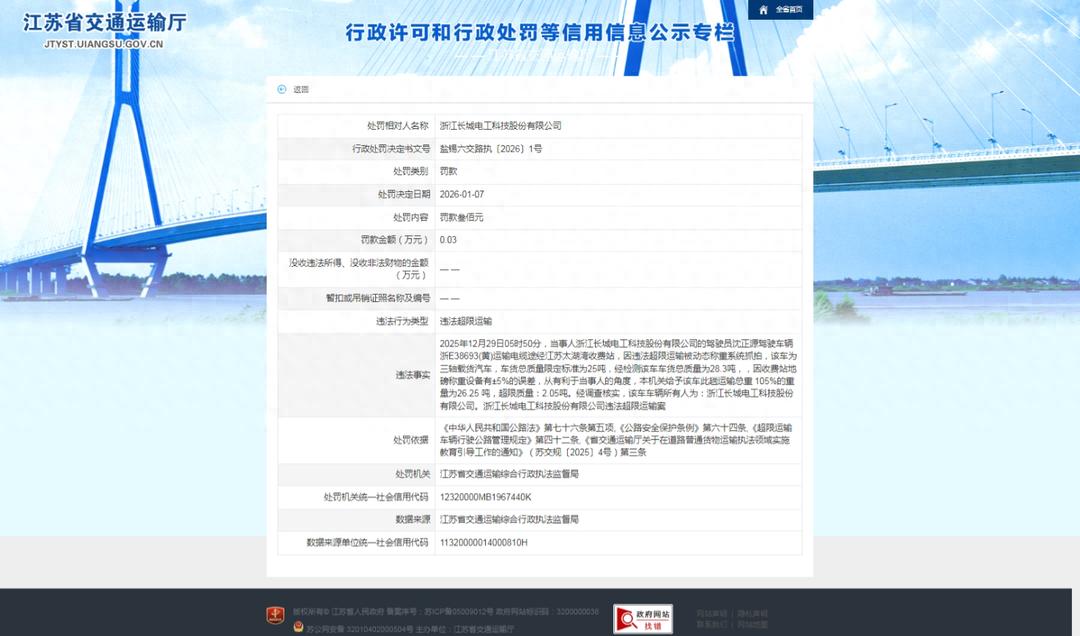 齐鲁晚报·齐鲁壹点记者于江苏省交通运输厅行政处罚栏获悉,1月7日,长城科技(603897.SH)收行政处罚决定书,违法行为类型为“违法超限运输”,处罚机关是江苏省交通运输综合行政执法监督局。