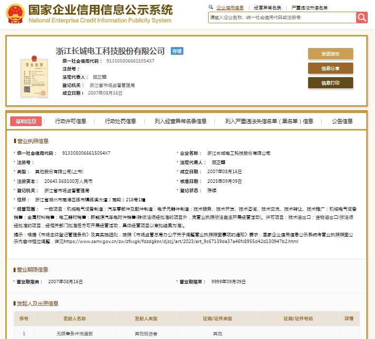 国家企业信用信息公示系统显示,浙江长城电工科技股份有限公司成立于2007年,法定代表人顾正韡,注册资本20643.5681万元人民币。