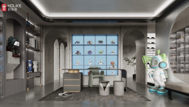 聚合多品类潮流的收藏展示功能空间引领潮流,热爱潮流艺术潮玩收藏的市场正在快速崛起,引发潮玩收藏之家的需求,而90后人群是潮流市场的主力军。潮玩收藏主题空间以多功能工作室+衣帽间的形式呈现,将潮玩、饰品的展示、收藏与个人办公、娱乐相结合,空间柜体、护墙运用缪斯灰花色,搭配玻璃掩门,营造潮玩艺术主题氛围。