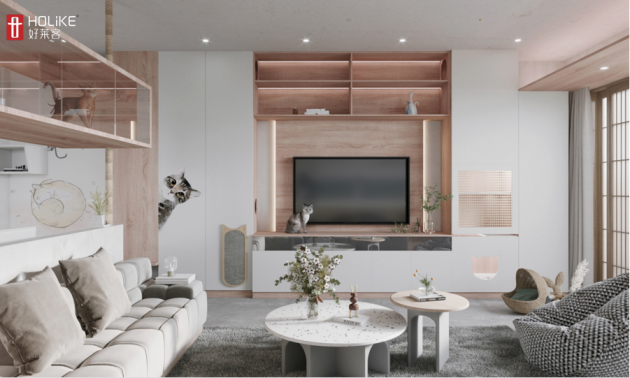 “人宠合一”的舒适家居家居空间据CBNData《2019宠物消费生态大数据报告》,中国养宠家庭已达9978万户,大部分养宠家庭把宠物宠爱成“毛孩子”,视宠物为家庭一员。好莱客基于用户洞察,打造28㎡宠物主题公寓房,将宠物的收纳、饮食、娱乐、睡眠空间与人类使用空间相聚合,找到人宠互动与各自功能使用的平衡点,构建“人宠合一”的舒适家居空间。宠物主题公寓房的空间柜体、护墙运用贝加尔灰橡花色,搭配杏白平板门,营造温馨舒适的宠物主题空间氛围。
