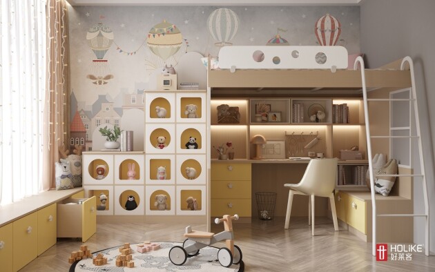 随着生活品质的提升,中国家庭越来越注重孩子的成长空间,好莱客为了更好的满足家长与孩子对功能和情感的双重需求,推出天空之城Ⅱ系列儿童房空间,以孩子的角度开展空间设计,满足基础使用需求的同时,打造一个更适合孩子逐步健康成长的生活环境,承载孩子不同成长阶段的需求。天空之城Ⅱ系列以奶酪黄与晴空蓝为主调,在天空之城系列的基础上,新增趣味拉手、装饰储物柜模块、童趣前挡板、圆弧装饰板、床梯等造型可爱的元素,增强儿童房的趣味性、艺术性和独特性,让异想成虹,折射出童趣的光彩。