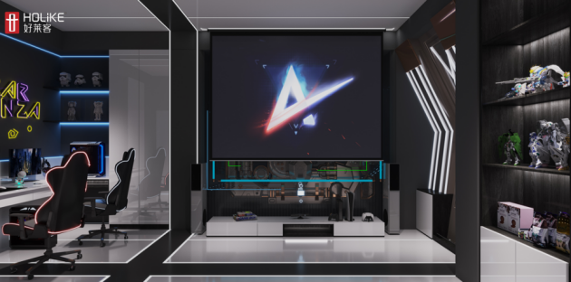 截止2020年,电竞行业用户规模已达到5亿之多,在圈层文化中,“电竞”绝对占有一席之地,好莱客基于电竞游戏类型的分类和使用的需求,推出电竞游戏+影音娱乐于一体的多功能空间。整体空间比传统书房更具有包容性,划分出PC端电竞区、主机游戏区/视觉影音区、装饰展示区、沙发休闲区。空间运用烟熏橡木作为柜身花色,白色高光门板、抽面,搭配绚丽的氛围灯光和软硬装呈现,将游戏虚拟空间场景搬入现实空间,融入电竞元素,营造出科幻机械风电竞主题的空间氛围。