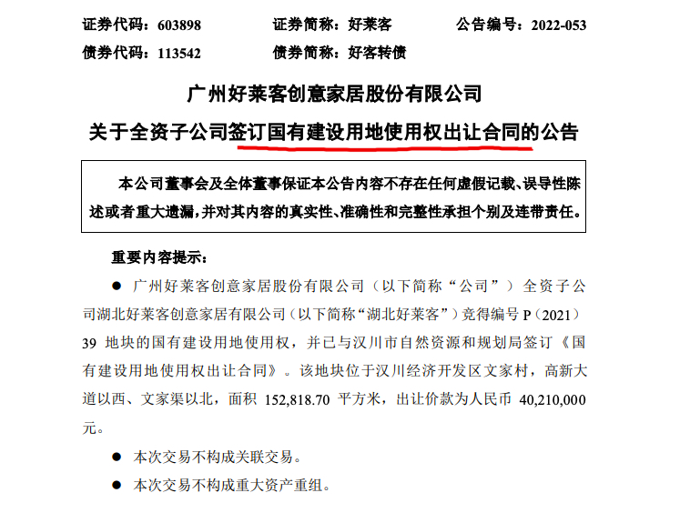 中华网财经8月3日讯:好莱客(603898)(603898.SH)发布关于全资子公司签订国有建设用地使用权出让合同的公告称,公司全资子公司湖北好莱客创意家居有限公司(下称“湖北好莱客”)竞得编号P(2021)39地块的国有建设用地使用权,并已与汉川市自然资源和规划局签订《国有建设用地使用权出让合同》。该地块位于汉川经济开发区文家村,高新大道以西、文家渠以北,面积152,818.70平方米,出让价款为人民币40,210,000元。