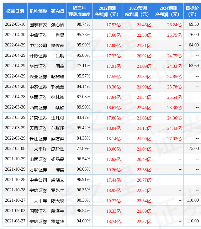 证券之星数据中心根据近三年发布的研报数据计算,国泰君安(601211)张心怡研究员团队对该股研究较为深入,近三年预测准确度均值高达98.74%,其预测2022年度归属净利润为盈利17.53亿,根据现价换算的预测PE为26.93。