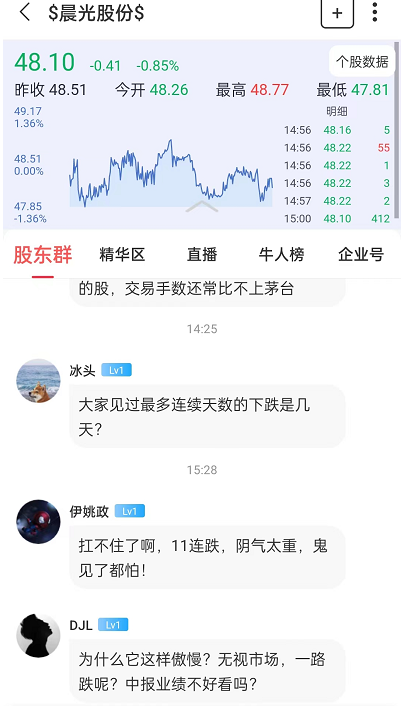 在尺度晨光股份股东群,有股民投资者表示,“扛不住了啊,11连跌,阴气太重,鬼见了都怕!”还有投资者表示“为什么它这样傲慢?无视市场,一路跌呢?中报业绩不好看吗?”