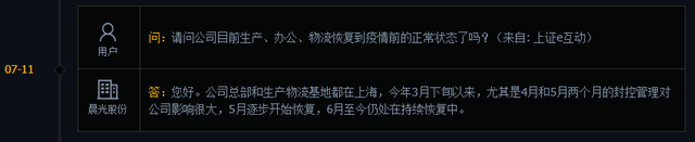 目前,晨光股份并未公布上半年业绩预告,不过在投资者互动平台,有投资者近期提问有关疫情对企业的影响。晨光股份表示,“公司总部和生产物流都在上海,疫情的影响对公司还是很大的,5月逐步开始恢复,6月仍处于恢复中。“