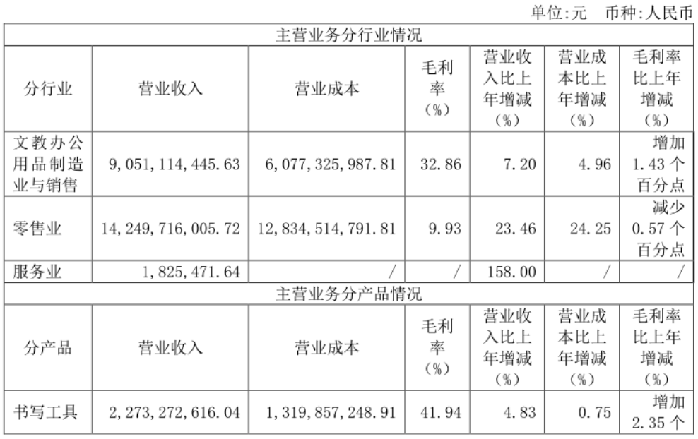 在民生证券的一份研报中,将晨光股份的营收结构描述为“一体两翼”:“一体”是指公司传统的文具业务,“两翼”分别是零售大店业务以及办公直销业务。