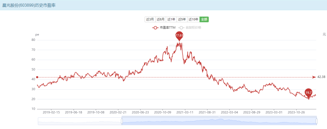 不难看出,晨光股份此前的传统文具业务属于高毛利率、现款现货、低负债的优质业务,这也是公司能够维持高估值水平的一个关键因素。2021年2月,晨光股份动态市盈率达到77倍的高位,成为公司冲击千亿市值的关键因素。