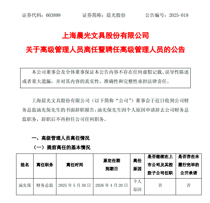 昨日,晨光股份发布公告称,汤先保因个人原因申请辞去公司财务总监职务,辞职后不再担任公司任何职务。